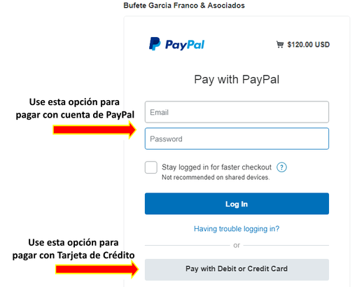 Pulse el siguiente ícono para realizar el pago de $120.00. Una ventana de pago de la entidad PayPal abrirá. Una vez realice el pago puede regresar a esta ventana para continuar con el proceso.
